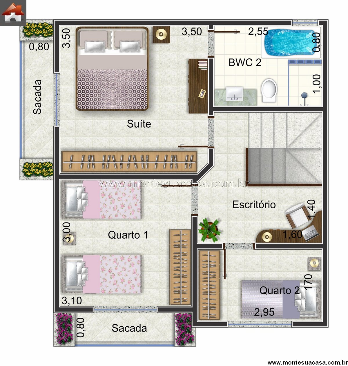No andar superior, com 52,51 m², estão os ambientes íntimos e de descanso. A suíte principal é espaçosa e conta com sacada privativa e banheiro (BWC 2) que garante conforto e privacidade. Os quartos 1 e 2 são bem distribuídos e possuem acesso à segunda sacada, proporcionando ventilação cruzada e iluminação natural.