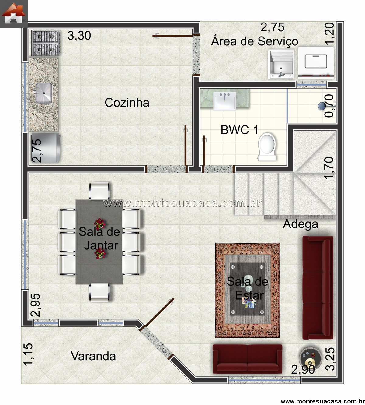 Logo na entrada, uma charmosa varanda convida para o convívio e recepção de visitantes. A sala de estar ampla e acolhedora conecta-se harmoniosamente à sala de jantar, proporcionando um espaço contínuo para momentos em família. Próximo à escada, há uma adega discreta, aproveitando o espaço de forma inteligente.