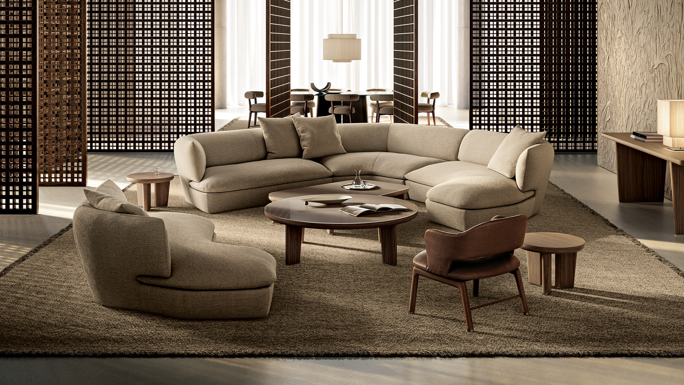 Showroom Dezeen: O arquiteto italiano Antonio Citterio rejeitou ângulos rígidos ao projetar este sofá curvilíneo e envolvente para o fabricante de móveis Flexform.