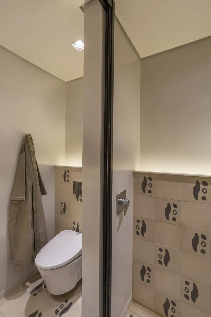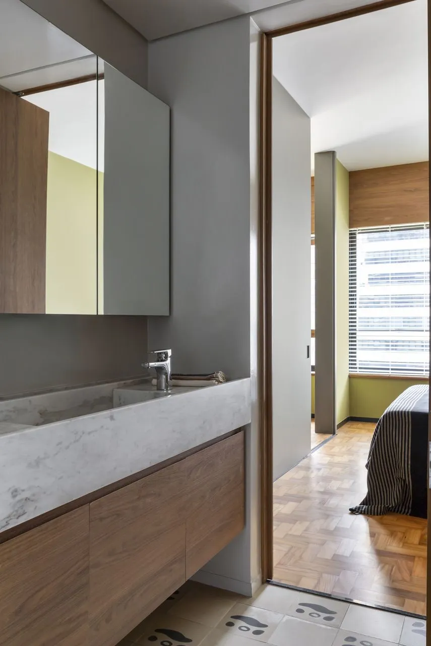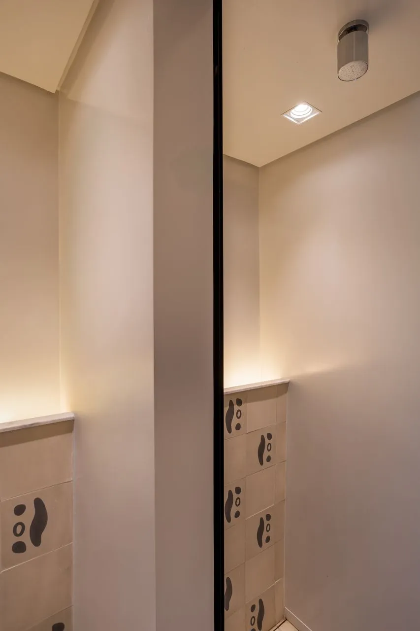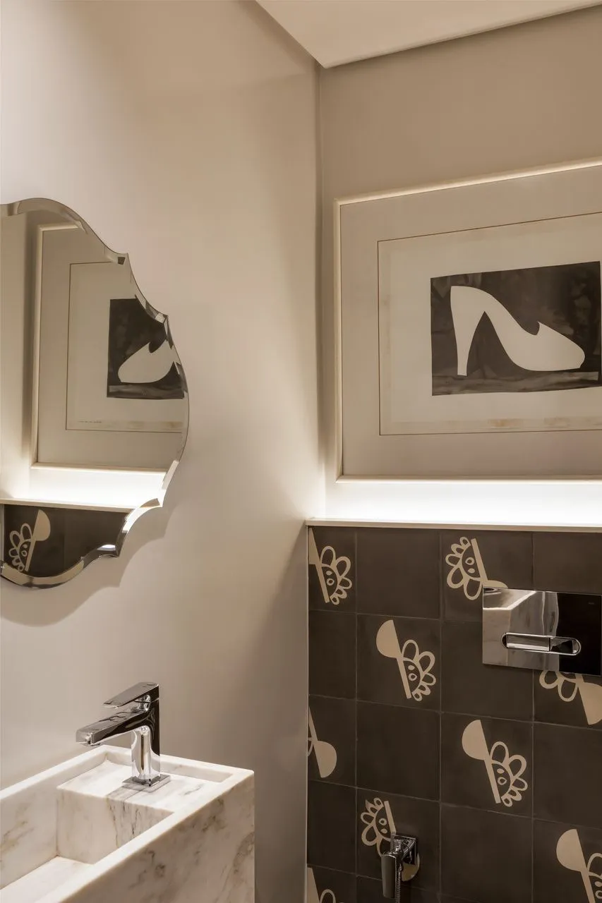 Durante o Open House, tive ainda a chance de conhecer um outro apartamento no mesmo prédio, também assinado pelo Edu. Apesar de compartilhar o gosto pelo garimpo, pelas obras de arte e por móveis de alta qualidade, esse segundo projeto é completamente diferente do primeiro, refletindo com precisão a personalidade da cliente. Na suíte, o banheiro chama atenção pelo piso de ladrilho hidráulico com padrões lindíssimos. A única coincidência entre os dois apartamentos? O quadro do Pelé, do mesmo tamanho e no mesmo lugar, quase um elo silencioso entre universos tão distintos.