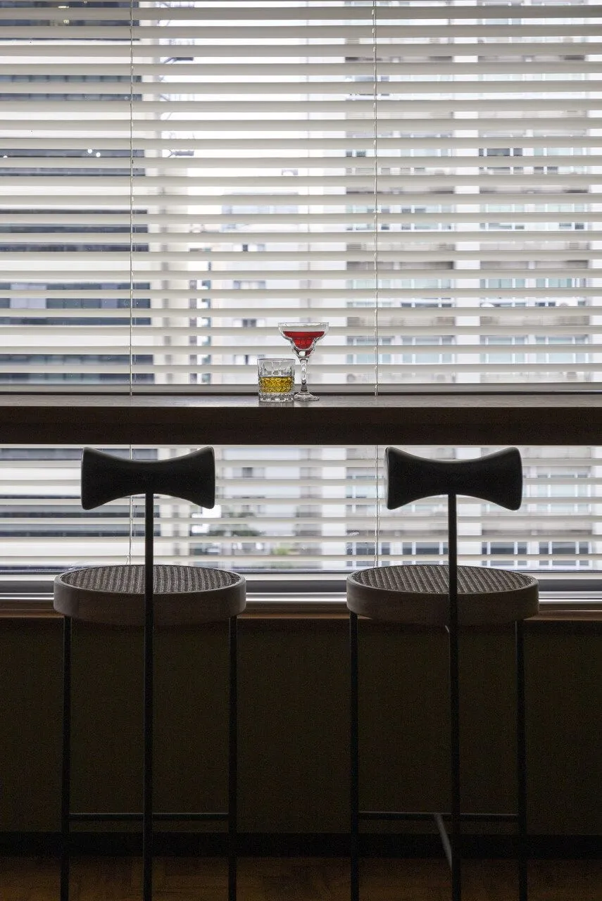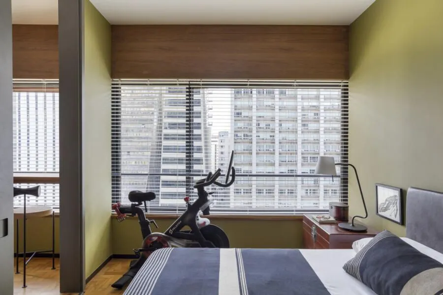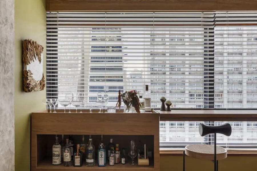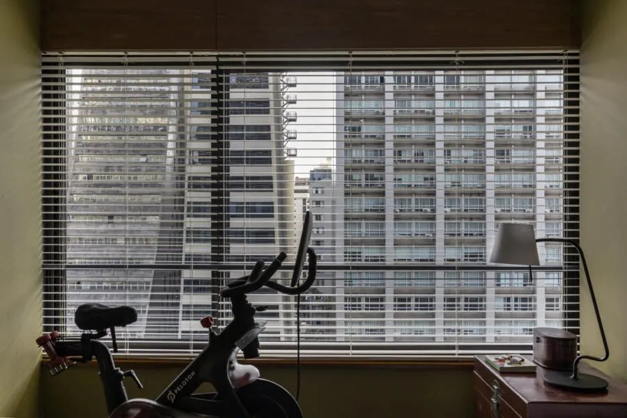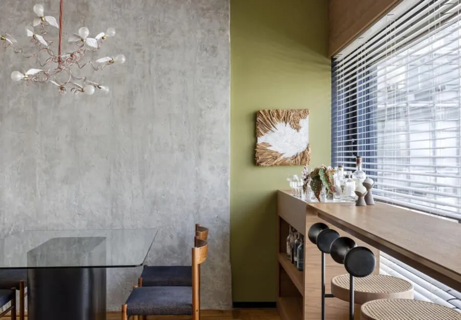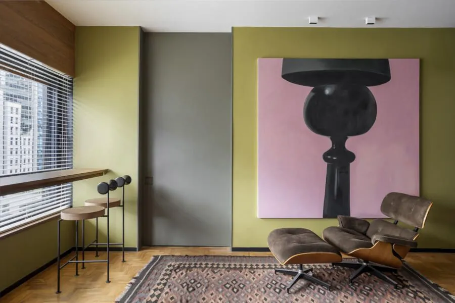 A cozinha é, sem dúvida, um dos grandes destaques do apê. Com uma estética industrial e moderna, ela aposta no cimento e no granito para criar um visual quase brutalista, marcado também pelas vigas aparentes. O resultado é um espaço prático, funcional e elegante — daqueles que funcionam muito bem no dia a dia, mas não abrem mão de impacto visual. Ali, um quadro com uma fotografia do Pelé em um momento importante de apoio ao movimento Diretas Já adiciona uma camada simbólica e potente ao ambiente. Na sala, além do mobiliário bem escolhido, a vista para a Avenida Paulista rouba a cena. É aquele tipo de paisagem urbana que muda ao longo do dia e dialoga diretamente com a proposta contemporânea do projeto. Já o quarto traz um clima mais minimalista e se integra parcialmente à área social. Edu conta que esse ambiente ainda está em desenvolvimento, parte de um processo contínuo de criação, com novas ideias que devem surgir ao longo do tempo.