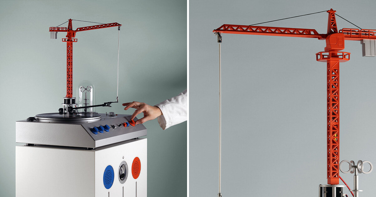 Amo Hutén reimagina o toca-discos como uma máquina semi-absurda intencionalmente superconstruída, onde o som não é mais apenas tocado, mas executado ativamente. Encomendado para Rebin Shah, o pedaço substitui o braço convencional por um guindaste vermelho brilhante que navega fisicamente pela superfície do vinil, transformando o ato de ouvir em uma operação tátil, quase teatral.