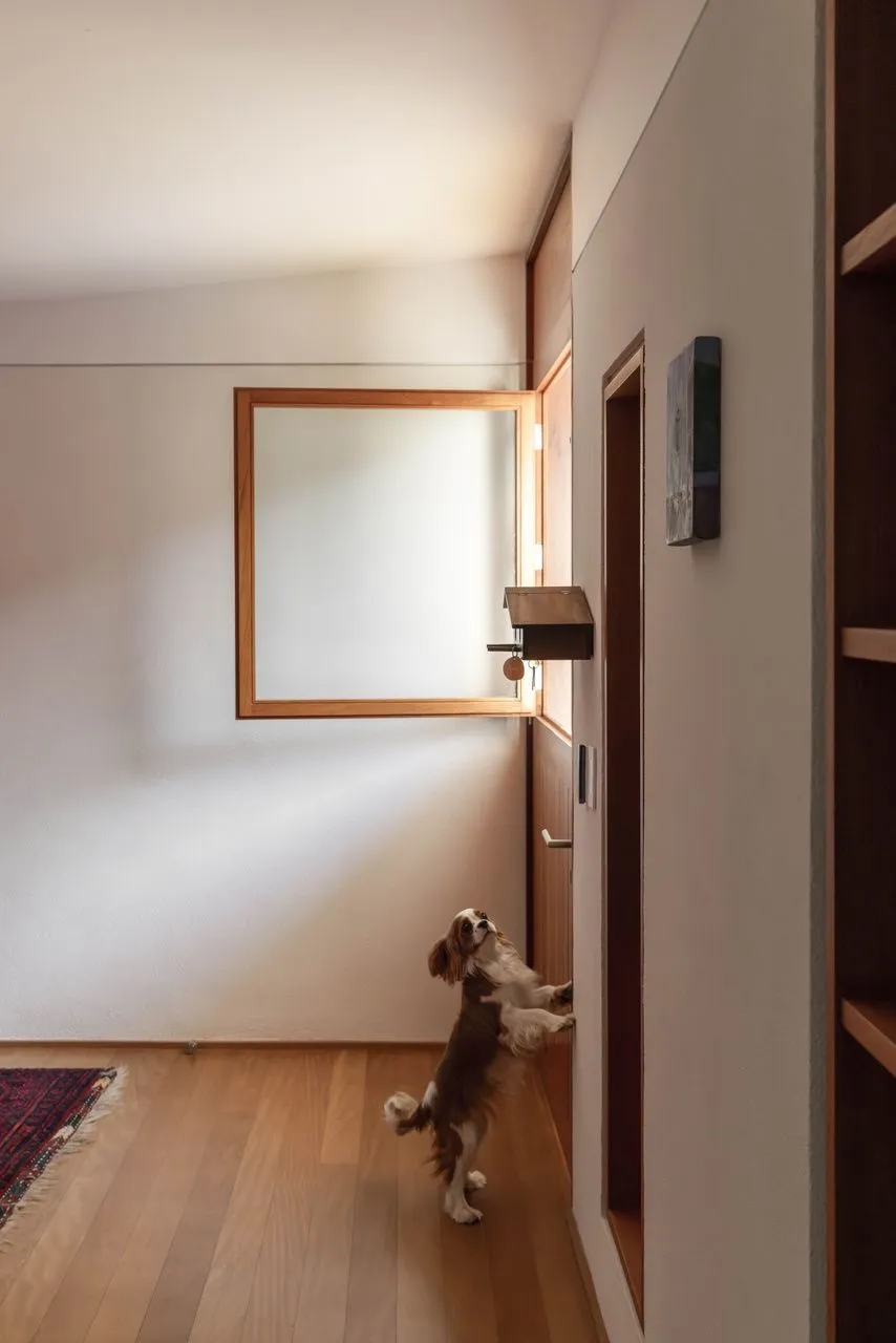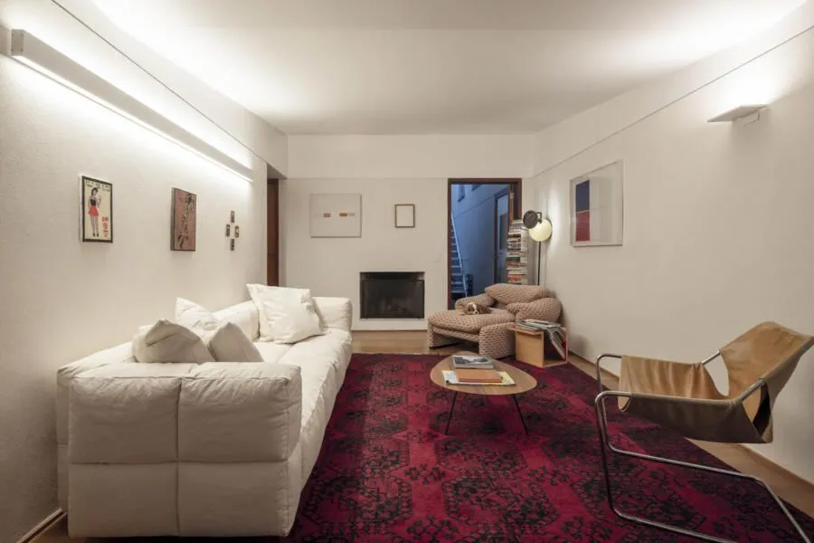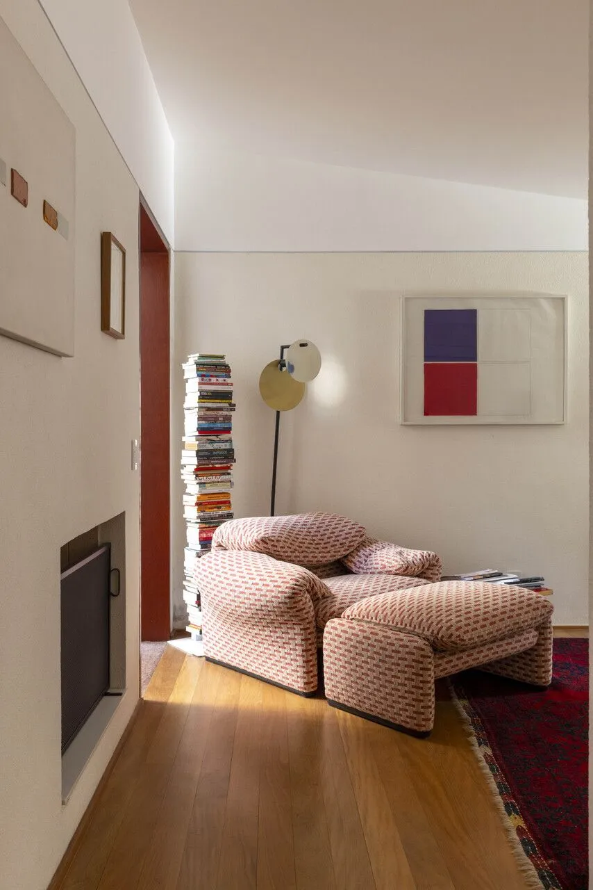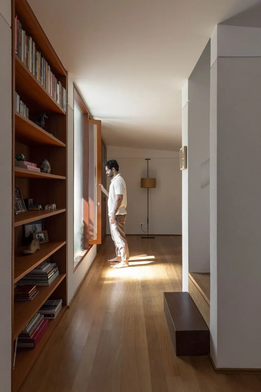 A luz natural também foi conduzida com bastante precisão. As claraboias e aberturas zenitais fazem com que a iluminação acompanhe o dia, mudando a percepção dos espaços ao longo das horas. Na escada, isso fica ainda mais evidente: a luz desce pelo vão e transforma completamente a experiência de circulação.