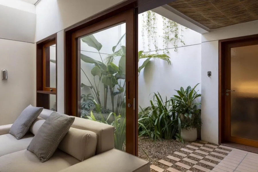 Por dentro, o que mais me interessou foi perceber como a casa passou a funcionar sem depender de corredores. A circulação é quase intuitiva, costurando os ambientes de forma fluida. A área social, com estar com lareira, jantar e cozinha, se organiza como um único espaço contínuo que se abre para o pátio central. É ele que garante luz e ventilação para os ambientes ao redor e, ao mesmo tempo, cria um ponto de respiro no meio da casa.