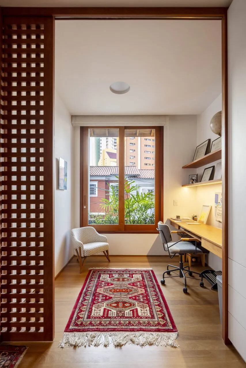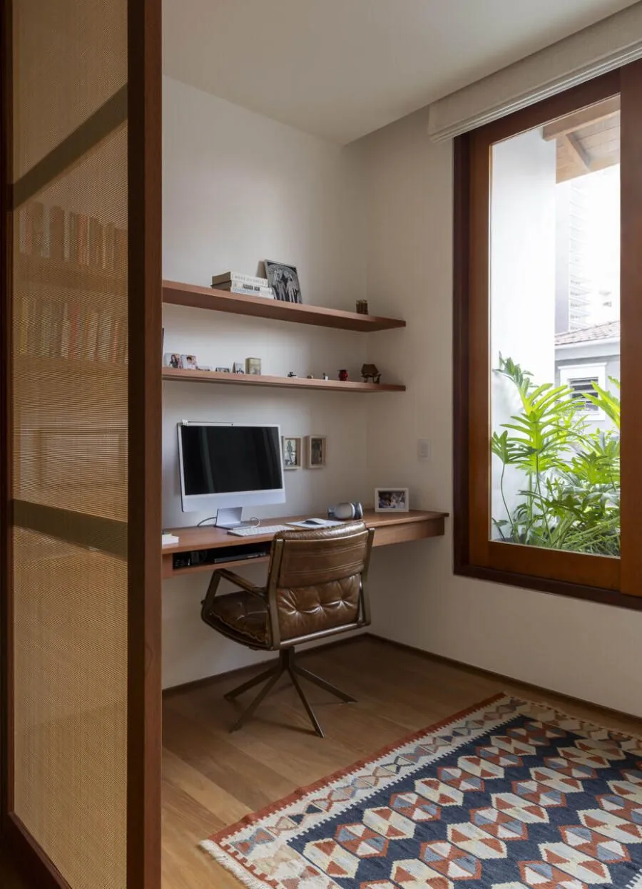 No pavimento superior, as quatro suítes seguem essa lógica de integração, com duas delas incorporando áreas de trabalho. E, no topo, o terraço com floreiras e horta traz o verde para dentro da rotina, reforçando uma conexão que aparece em vários momentos do projeto.