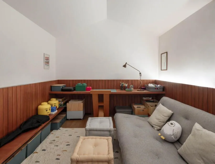 Durante a visita, um elemento apareceu o tempo todo, ainda que de forma sutil: o desenho dos forros. Em vez de serem apenas acabamento, eles ajudam a definir os espaços. No térreo, as variações de altura organizam os usos; na brinquedoteca, o forro em forma de “casinha” cria um ambiente mais lúdico, pensado na escala das crianças.