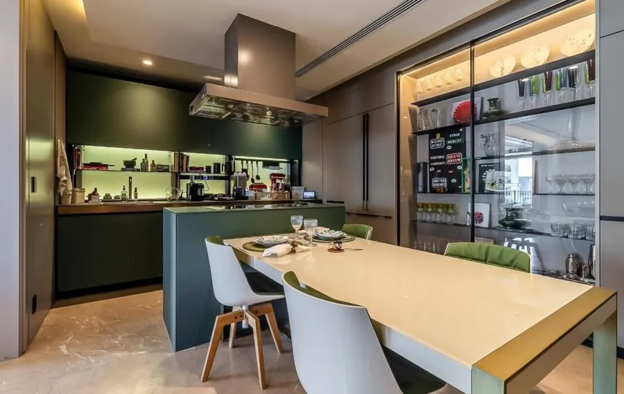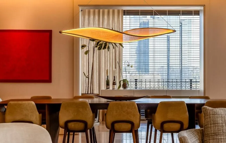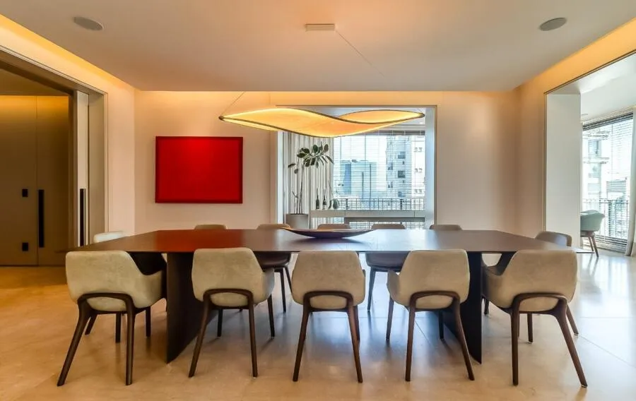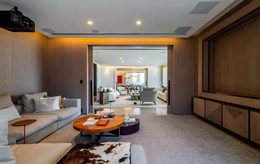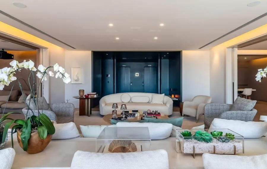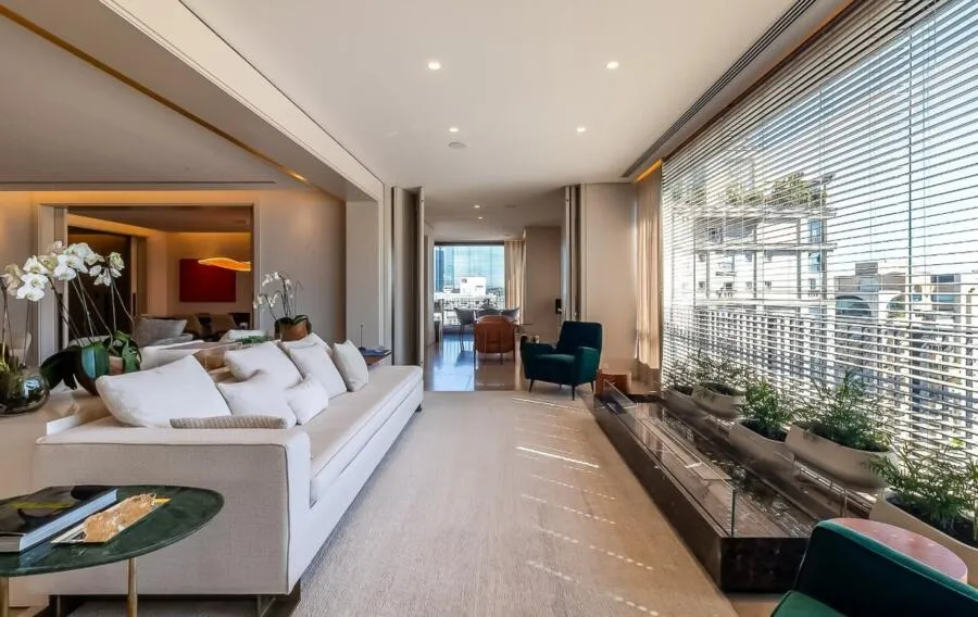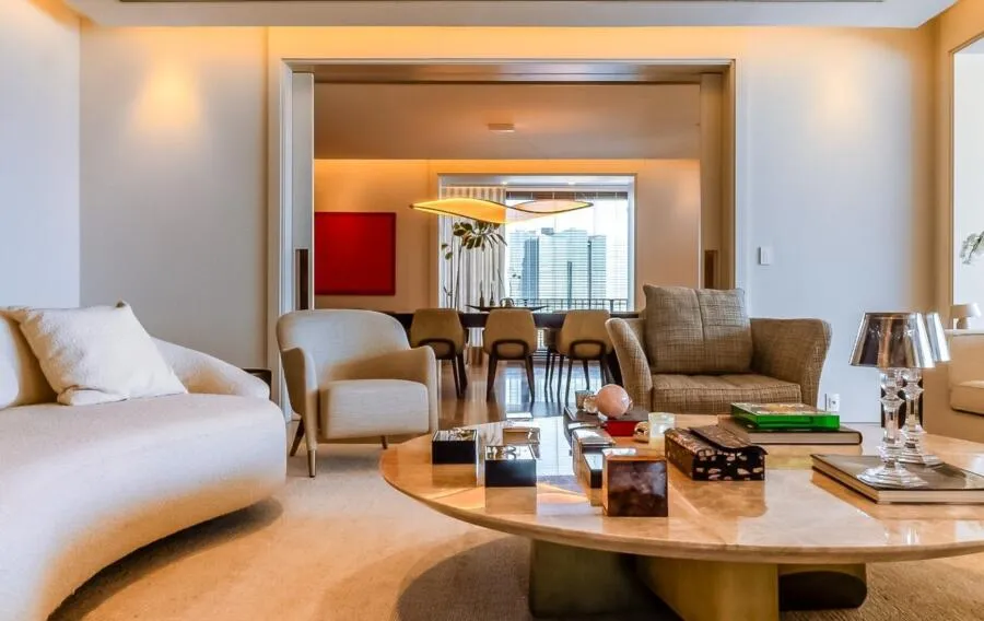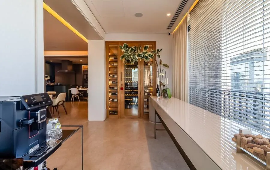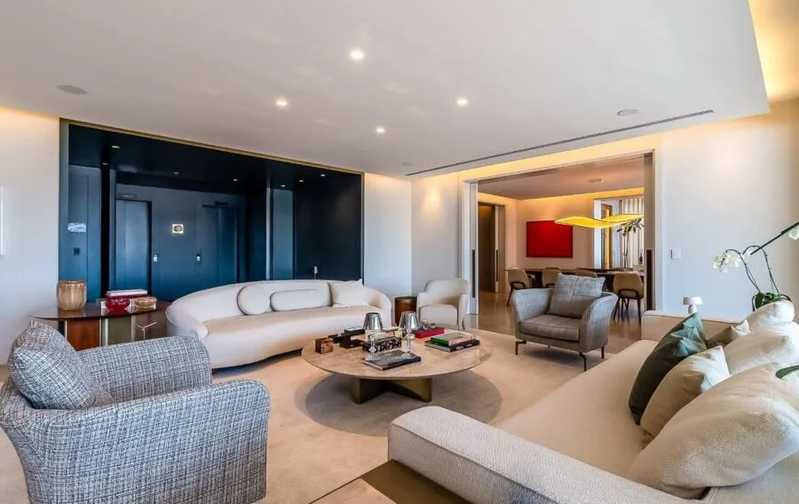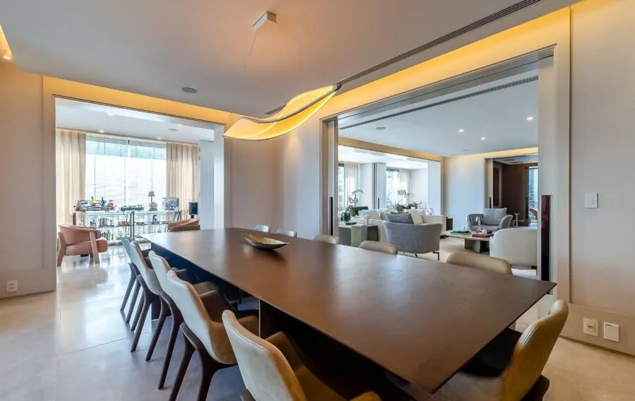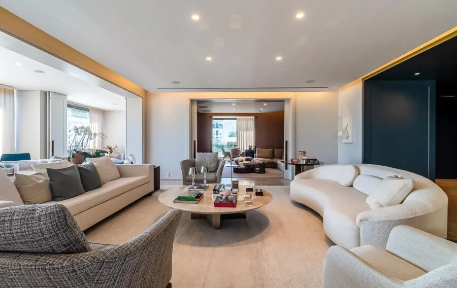 Ao entrar no apartamento de 554 m², a sensação é imediata: estamos diante de uma verdadeira casa suspensa sobre a cidade. O conforto vem da generosidade dos espaços, da escala bem resolvida e da forma como a luz natural atravessa os ambientes ao longo do dia. As varandas integradas ampliam ainda mais essa percepção e reforçam a elegância de um projeto pensado para ser atemporal, longe de excessos ou modismos.