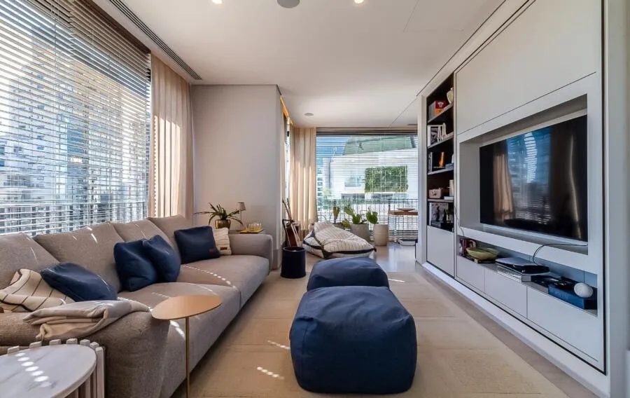 Uma das características que mais me encantaram neste imóvel é a sua versatilidade. Com portas que permitem isolar o living, os ambientes se transformam conforme a necessidade do momento, criando diferentes atmosferas para receber ou simplesmente viver com muito conforto. É um apartamento que funciona muito bem tanto para encontros longos e despretensiosos quanto para a rotina, sempre com aconchego, proporção e fluidez.