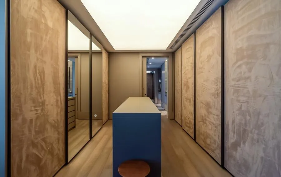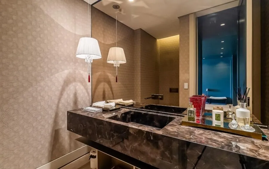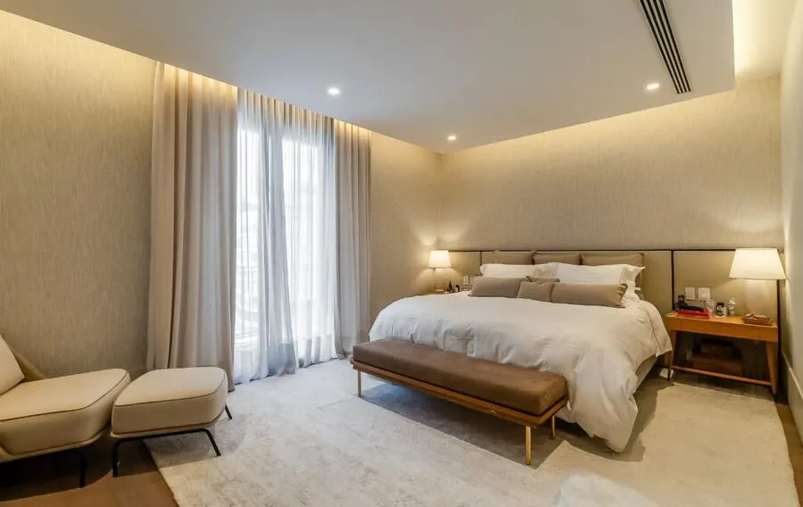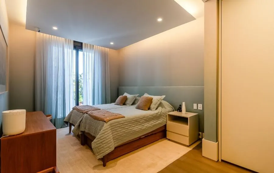 Na área íntima, a transição é sutil e natural. Os espaços se tornam mais reservados e acolhedores, pensados para o descanso e para a experiência de morar bem. A suíte principal traduz essa ideia com perfeição, evocando a sensação de hotelaria de alto padrão, onde tudo já está resolvido e cada detalhe contribui para o bem-estar.
