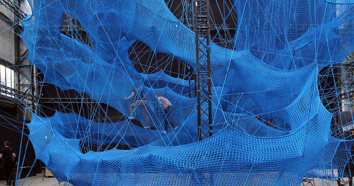 Pegue o tubo Numen/Para uso (veja aqui). Um túnel suspenso e flexível se estende pelo volume, feito de tecido elástico que responde ao peso corporal. À medida que você sobe, a estrutura se comprime e se expande, alterando a curvatura da superfície ao seu redor. A câmera lê essas mudanças como um campo contínuo, removendo bordas e cantos. O espaço torna-se um envelope macio que registra o movimento como distorção.